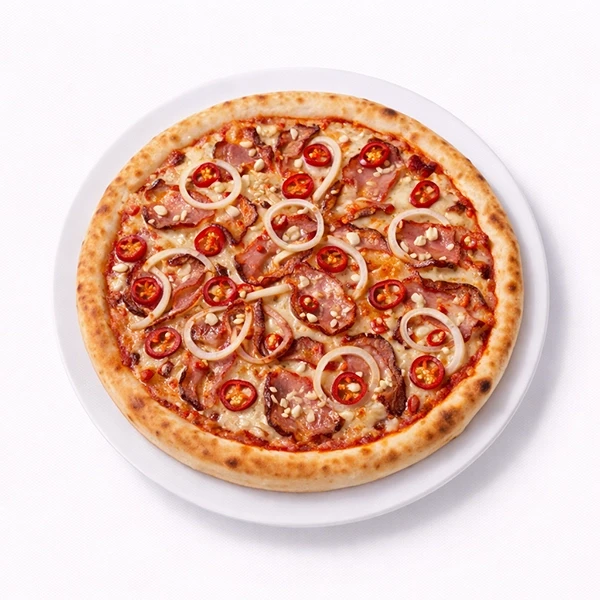 Tomatensauce, Mozzarella, Speck, Zwiebeln, Peperoncini und Knoblauch